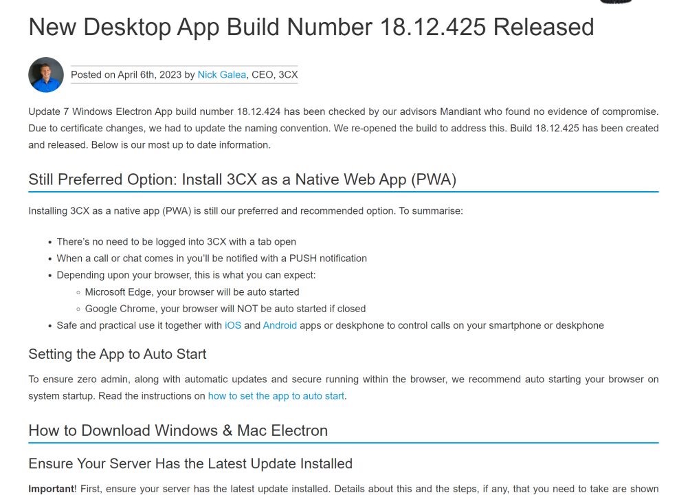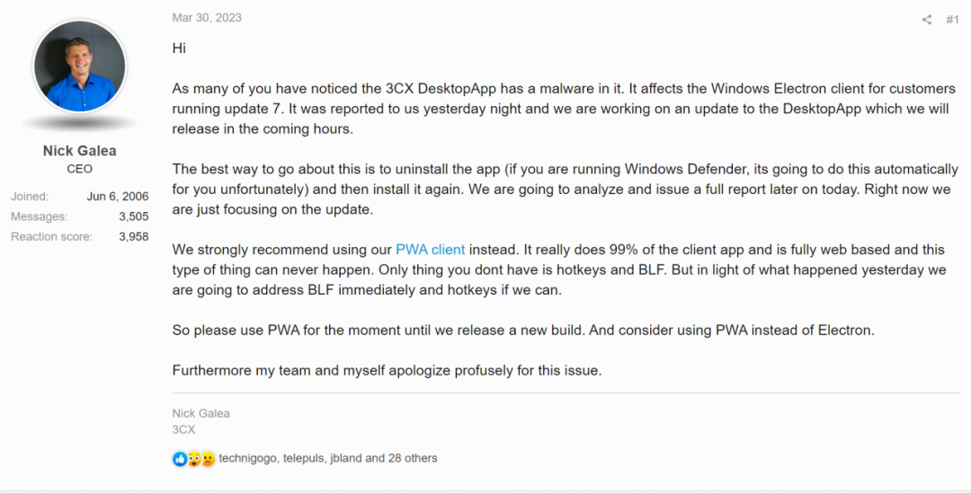 上午六点,3CX的CEO Nike Galea发出安全警告,确认3CX的Windows Electron client遭受攻击,并建议用户卸载该应用程序改而选择基于WEB的PWA客户端。