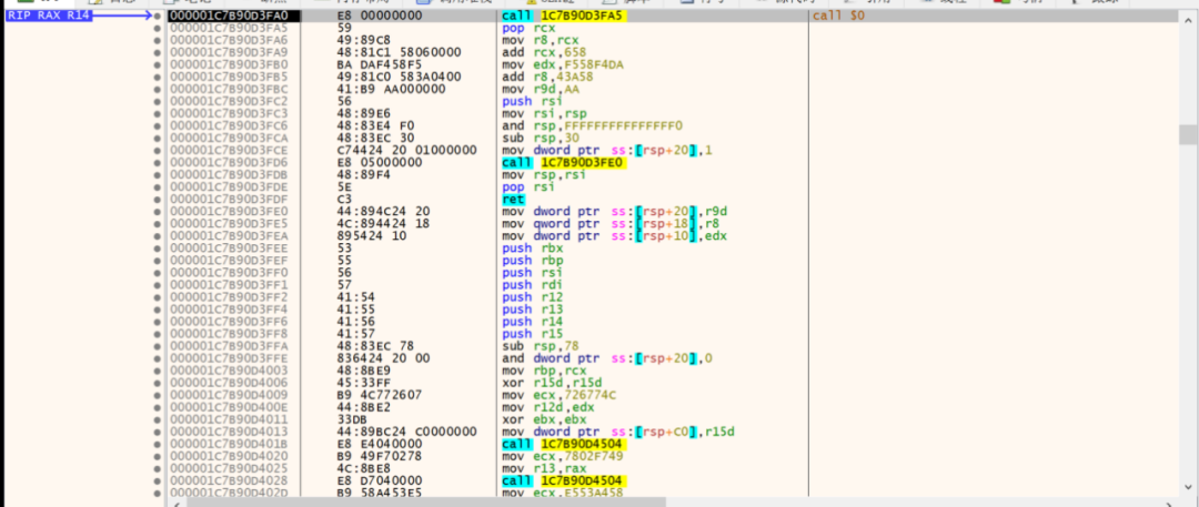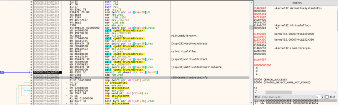 随后使用反射dll注入技术加载了放在shellcode中的dll文件,这里获取了一些dll函数用来后续修复导入表。