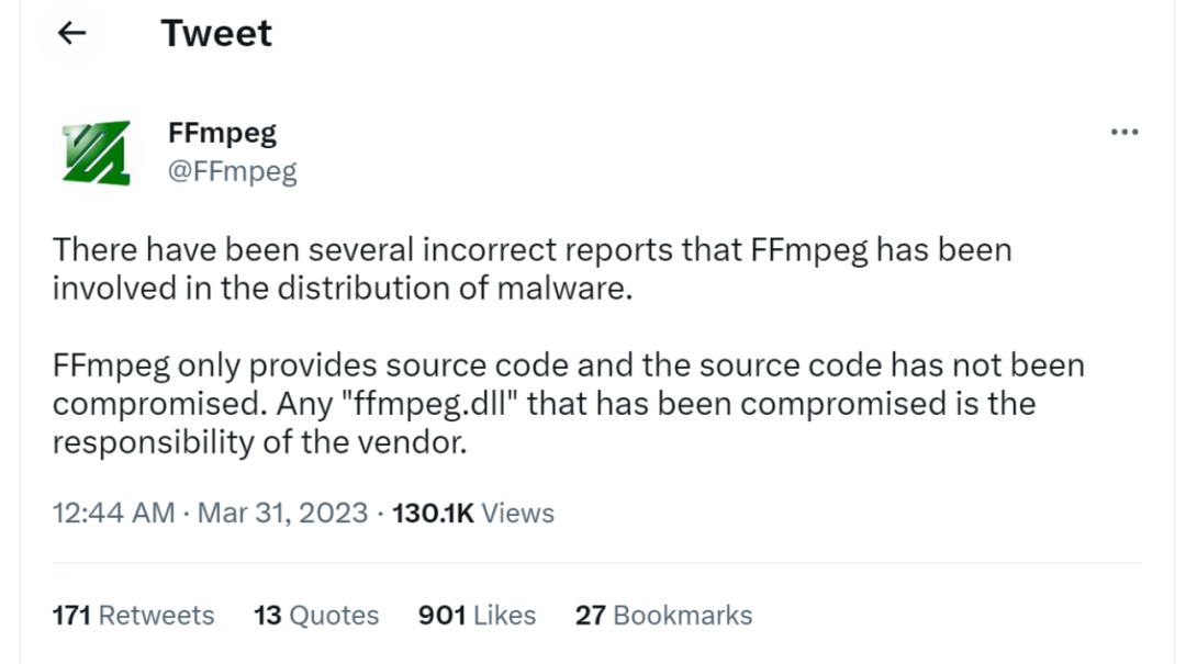 2023年3月31日,ffmpeg声明,其只提供源代码,编译的”ffmpeg.dll“由供应商提供。