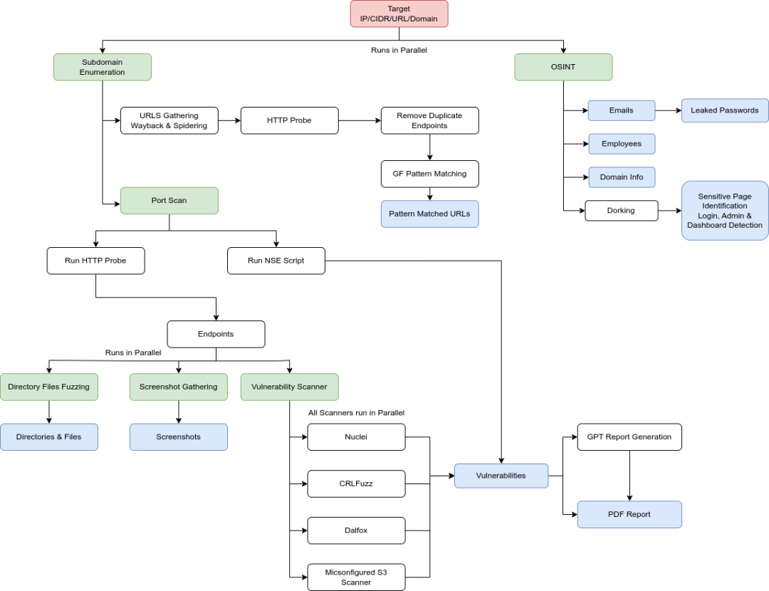 像这种自动化的方案有很多套,比如:Goby+xray或者Goby+AWVS、ARL+XRAY、ARL+AWVS,还有Rengine这种赏金自动化工具,主要的流程还是各种自动化信息收集最后漏洞扫描,通过工作流把不同的工具组合起来,使这个流程自动化。
