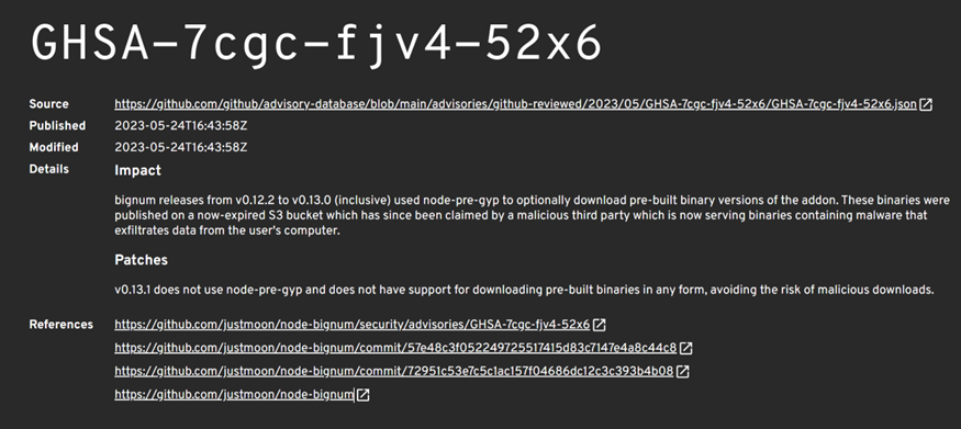 2023年5月24日,GDA报告该bignum的S3 Bucket被劫持,并在其Github仓库标识,标识符为GHSA-7cgc-fjv4-52x6。