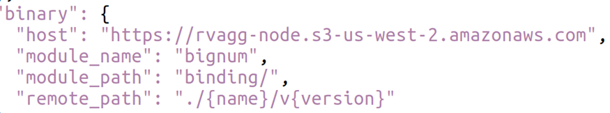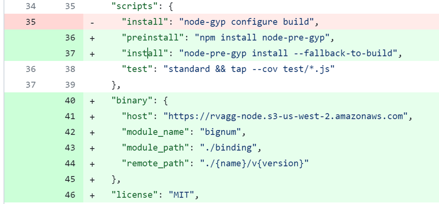 查看该开源包的Github仓库,发现其2016年6月15日提交的commit引入了node-pre-gyp工具。相关package.json文件配置为,在npm install bignum之前,会安装node-pre-gyp工具,并在npm install时,从 https://rvagg-node.s3-us-west-2.amazonaws.com 下载预编译的二进制文件,如果预编译的二进制文件无法使用,才在本地进行构建。