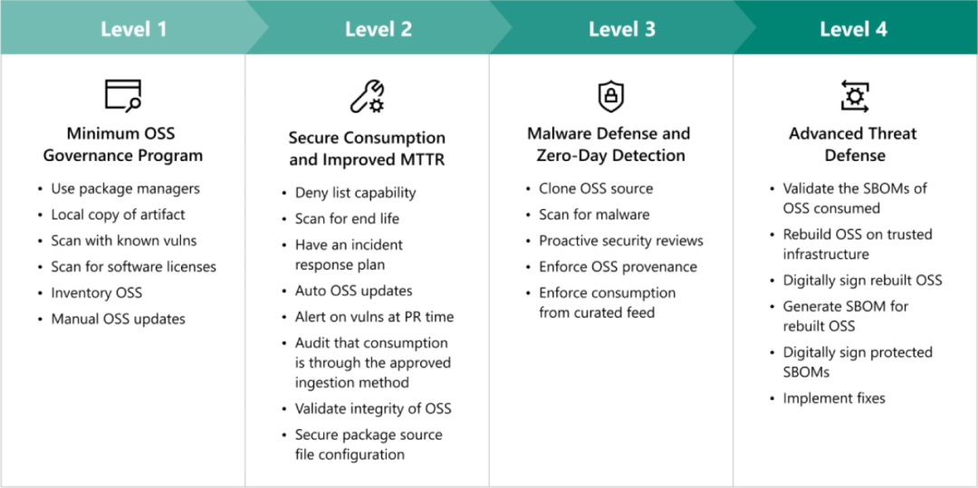 为了引导组织逐步优化其开源软件安全流程,微软将该框架设计为分级的成熟度模型,帮助企业按优先级逐步实施各项安全要求。