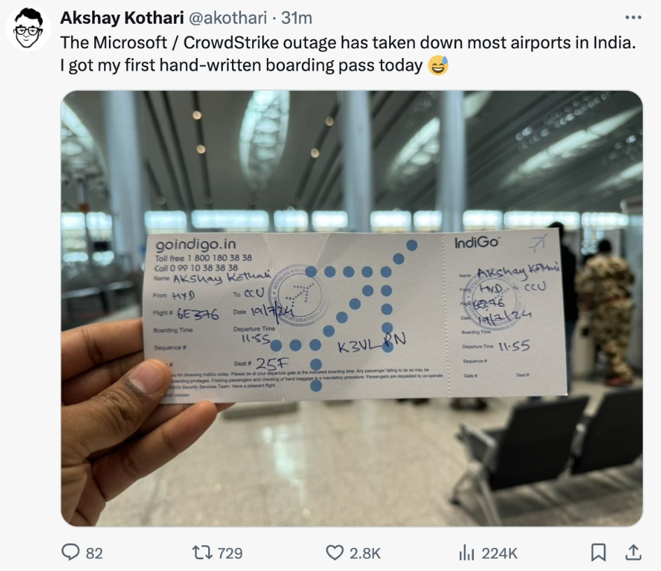 这个故障影响了Windows 7.11以上版本的系统,大约影响了850万台Windows设备,占全球Windows市场的不到1%,机场、医院、交通、媒体、酒店、餐馆等不同场所的系统中有大量的Windows系统用户和Falcon产品用户,以至于出现机场停摆,如美国航空公司当天取消了3400架次航班。众多乘客无法按时起飞,甚至需要手写机票。这个故障实际上不影响飞机飞行功能,但会影响塔台、航站楼的系统。