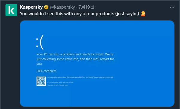 作为俄罗斯的老牌安全公司,卡巴斯基(Kaspersky)在7月19日当天发布一条贱贱的推文: