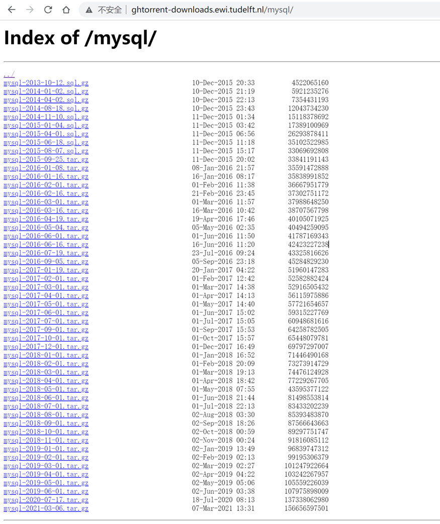1. 通过ghtorrent.org网站可以访问GitHub上用户名和组织名的历史记录。数据集在http://ghtorrent-downloads.ewi.tudelft.nl/mysql中