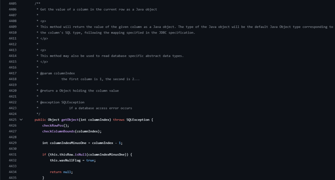 该漏洞的问题出在src/com/mysql/jdbc/ResultSetImpl.java的第3432行代码(https://github.com/mysql/mysql-connector-j/blob/402933ef52cad9aa82624e80acbea46e3a701ce6/src/com/mysql/jdbc/ResultSetImpl.java#L3422-L3450 ),这段代码位于getNativeConvertToString方法中,这个方法作用是用来转换数据库中存储的原生数据,并将它展示返回给应用,所以在数据转换前需要做数据类型判断。