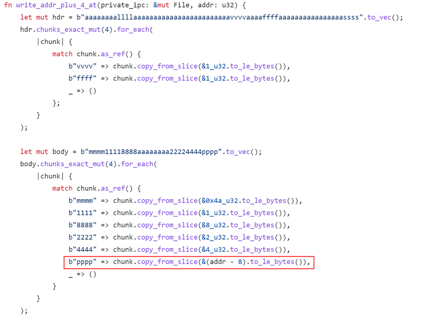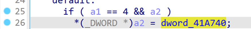 随后通过以下代码改变0x0041A740处的值,也就是上述的全局变量DWORD的值。这里write_addr_plus_4_at内部代码处理地址-8,是为了对应上述的v3[2]=(unsigned int)(v3+3)。于是0x0041A742开始的DWORD变成了0x0041A746,由于intel是小端序,所以0x0041A740处变成了01 00 46 A7。