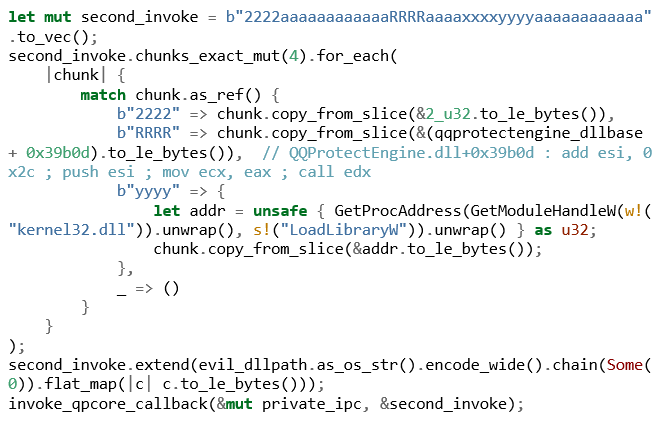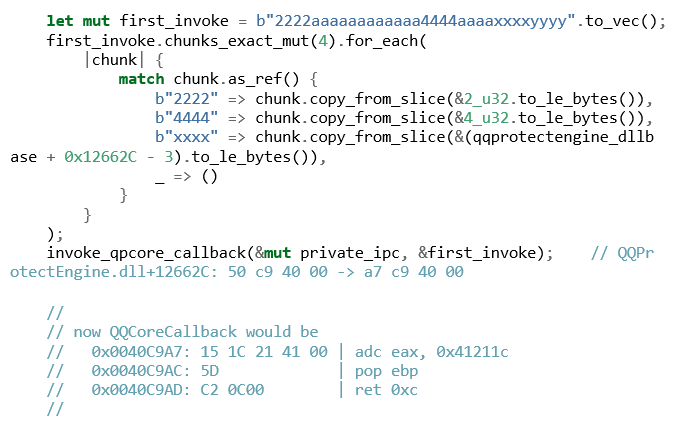 在这之后就是触发QPCore的回调函数,来覆盖QPCore的回调函数地址。如下述代码,qqprotectengine_dllbase + 0x12662C - 3为了只让A7一个字节覆盖,这时候QPCore的回调函数地址为0x0040C9A7。