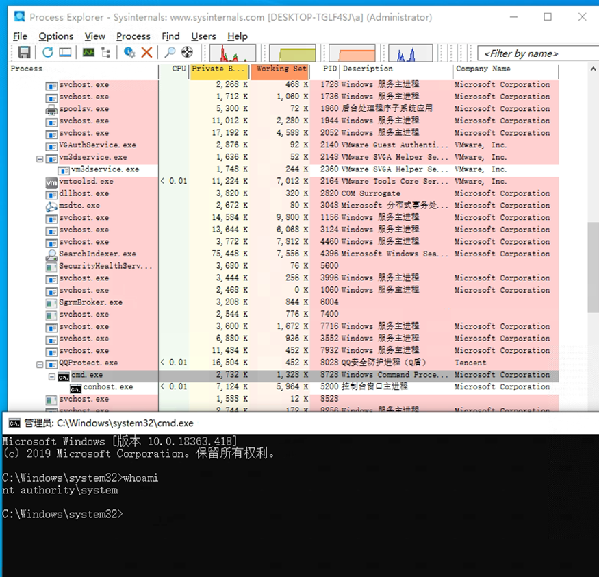 由于当前进程QQProtect.exe的权限为NT Authority\SYSTEM,故而获取的是最高权限的shell。
