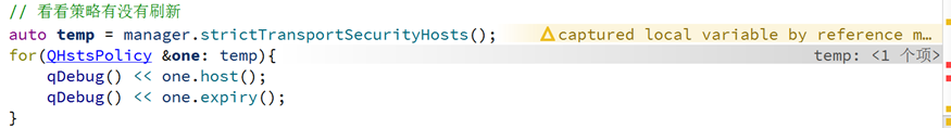 manager.strictTransportSecurityHosts函数能获取当前的HSTS策略。当执行到QObject::connect内时,可发现temp中添加了一项策略。