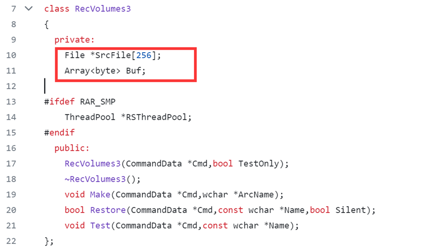 基址偏移0x1F542处对应的代码SrcFile[CurArcNum]=(File*)NewFile;,查看SrcFile定义,发现其是一个File指针的数组,大小为256,随后跟了一个类型为Array的变量。