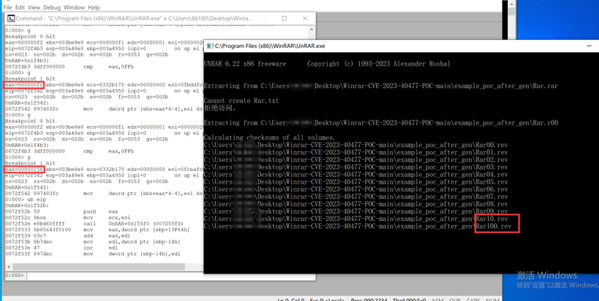 如果eax>0xFF就是溢出,可以看到处理Rar100.rev的时候已经溢出了。