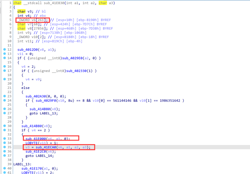 为了确定溢出偏移回到加载的初始地方,对this的指针打内存写入断点,发现断在sub_41E000内部。其函数主要对this的前0x400字节进行了置0。可以发现这可以和256大小的File指针数组对上(32位软件一个指针占4字节,256*4 == 1024 == 0x400),随后的5字节是Array变量,但是在源码中只发现了四个字节的内容。