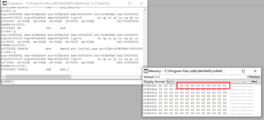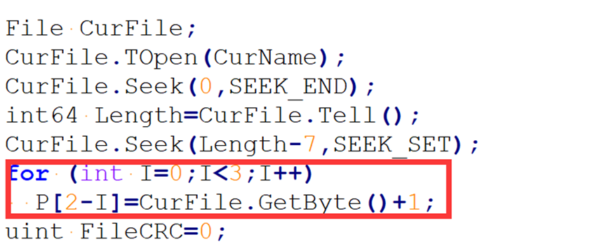 最后对PoC生成及数据来源进行分析。以PoC中的Rar00.rev为例。首先对P[3]进行了初始化,数据来源于文件倒数第七个字节开始的三个字节。Rar00.rev此处的数据为F0 00 00,由于加一会导致其在内存中初始化为01 01 F1。